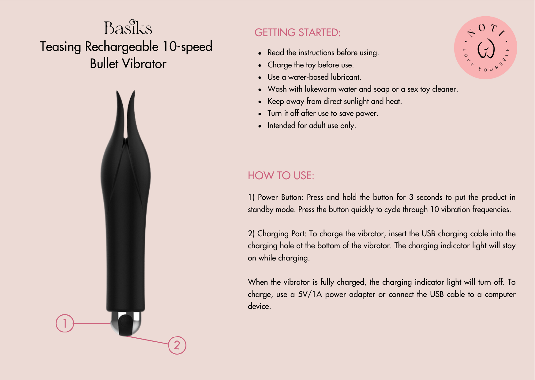 Crave every experience the Basiks Teasing bullet vibrator has to offer and lust for every drop of luxurious pleasure it's crafted to deliver. 10 vibration speeds Unique bunny ears design IPX7 waterproof rating Tease your senses with the Teasing bullet vibrator.