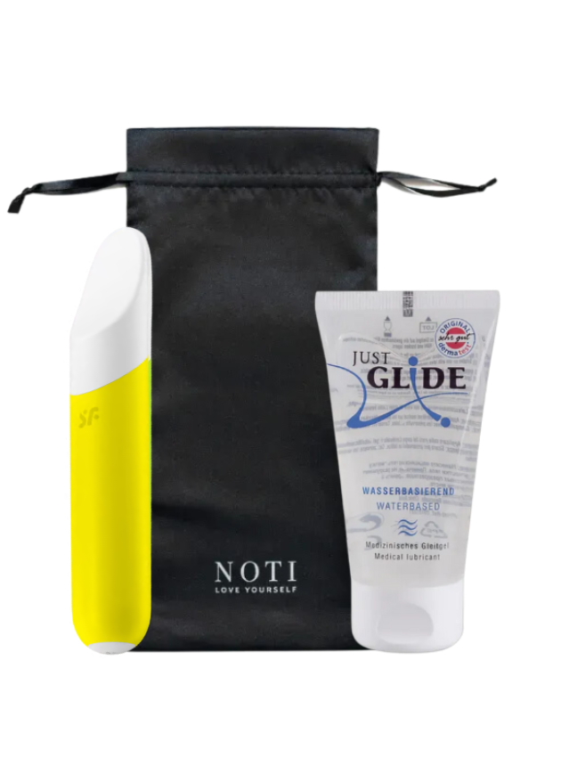 Ready to level up your self-care? This specially curated bundle featuring the Just Glide Water-Based Lubricant (50 mL), NOTI Silk Pouch Small, and the powerful Satisfyer Ultra Power Bullet 7 Vibrator has everything you need for smooth, sensual, and satisfying experiences.