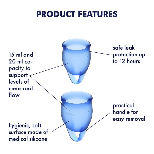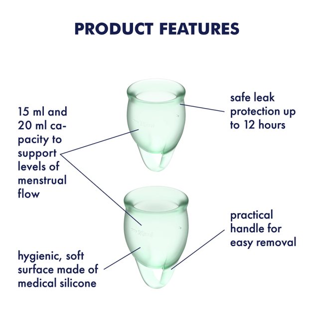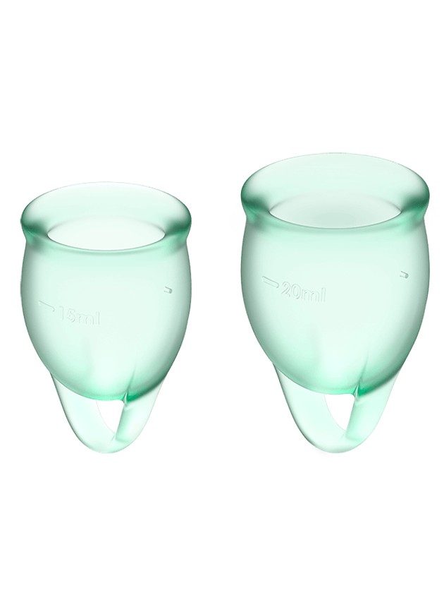 Satisfyer Feel Confident Menstrual Cups keep you comfortable and protected during your period: The set contains two menstrual cups (15 ml and 20 ml) which are suitable for light to heavy flows. Because the cups are made of medical-grade, flexible silicone, they adapt to your contours and ensure a high level of comfort while wearing.